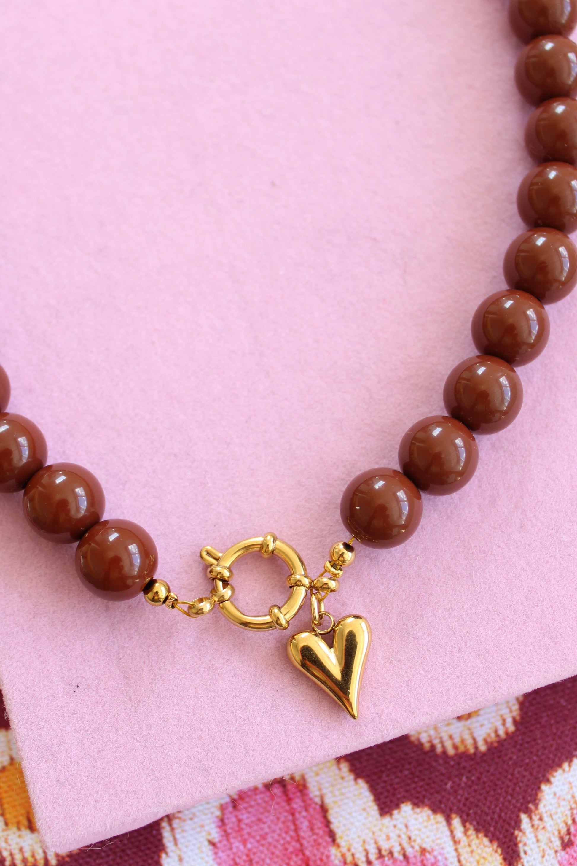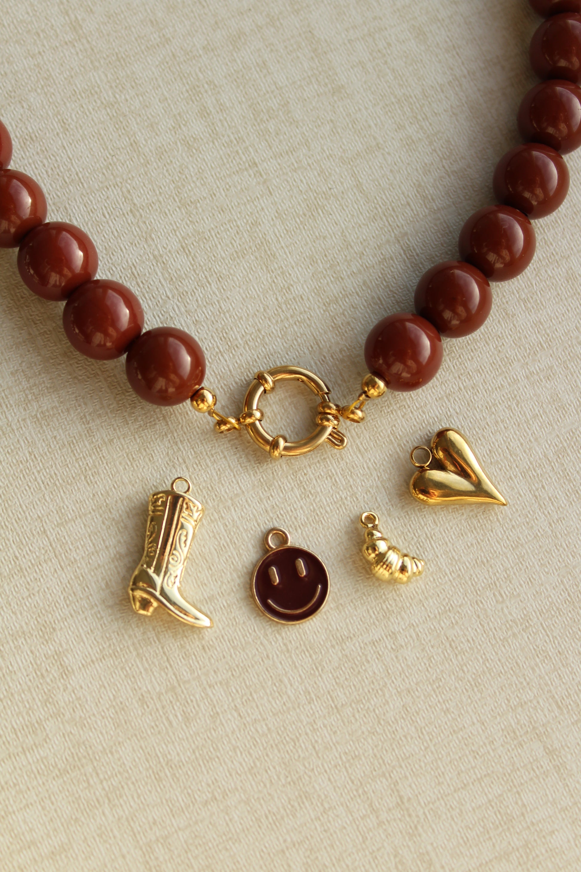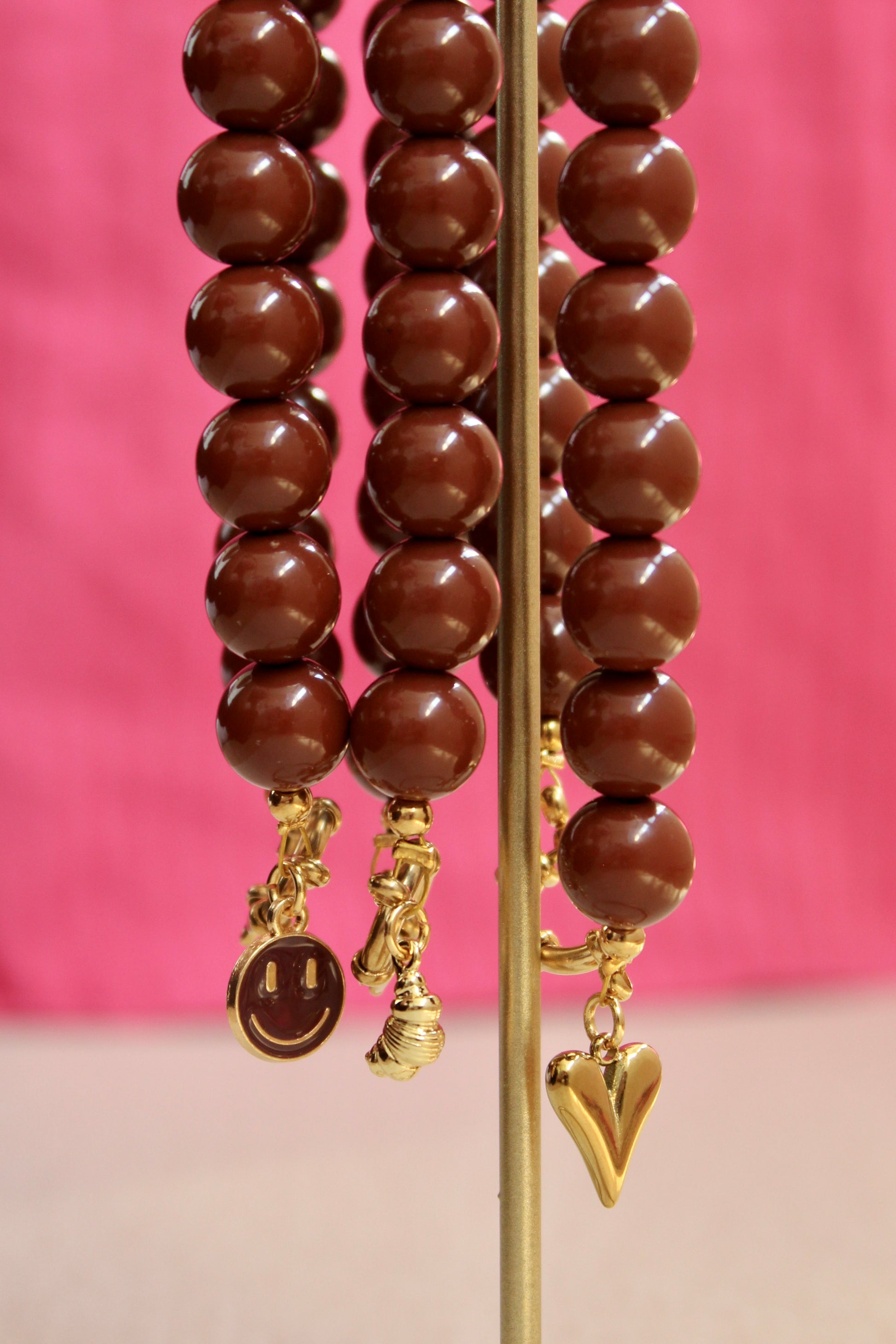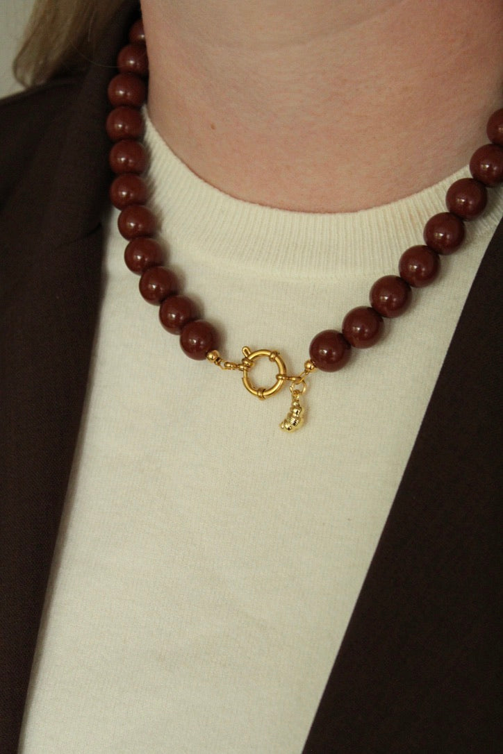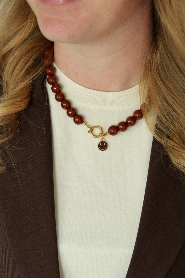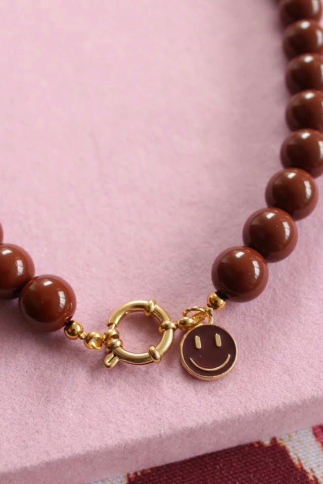 Een chique bruine handgemaakte kralenketting, afgewerkt met een geweldige gouden bedel. Afgewerkt met een prachtige gouden bedel. Keuze uit een croissant, een hartje of een bruine smiley. 🤎🥐✨