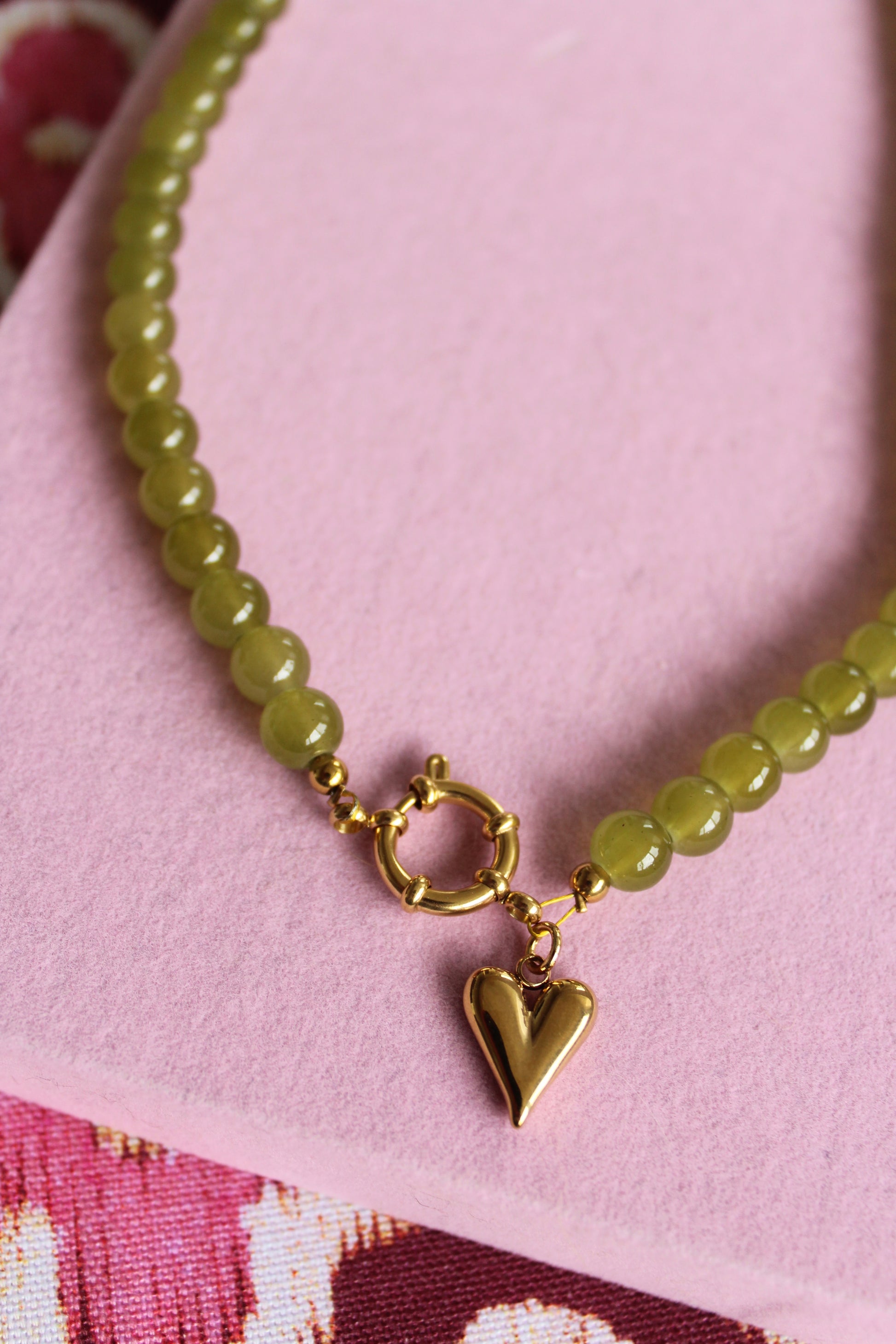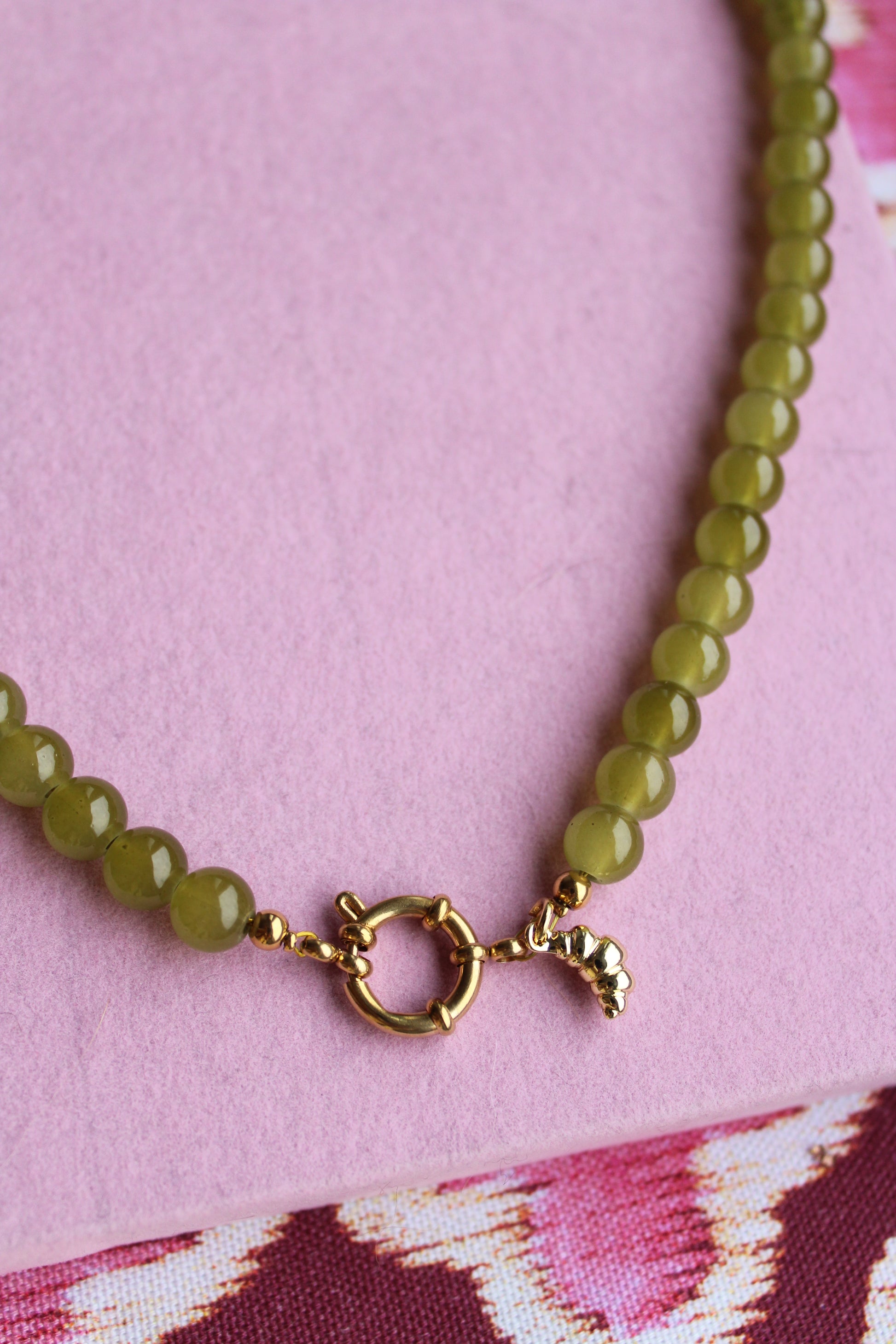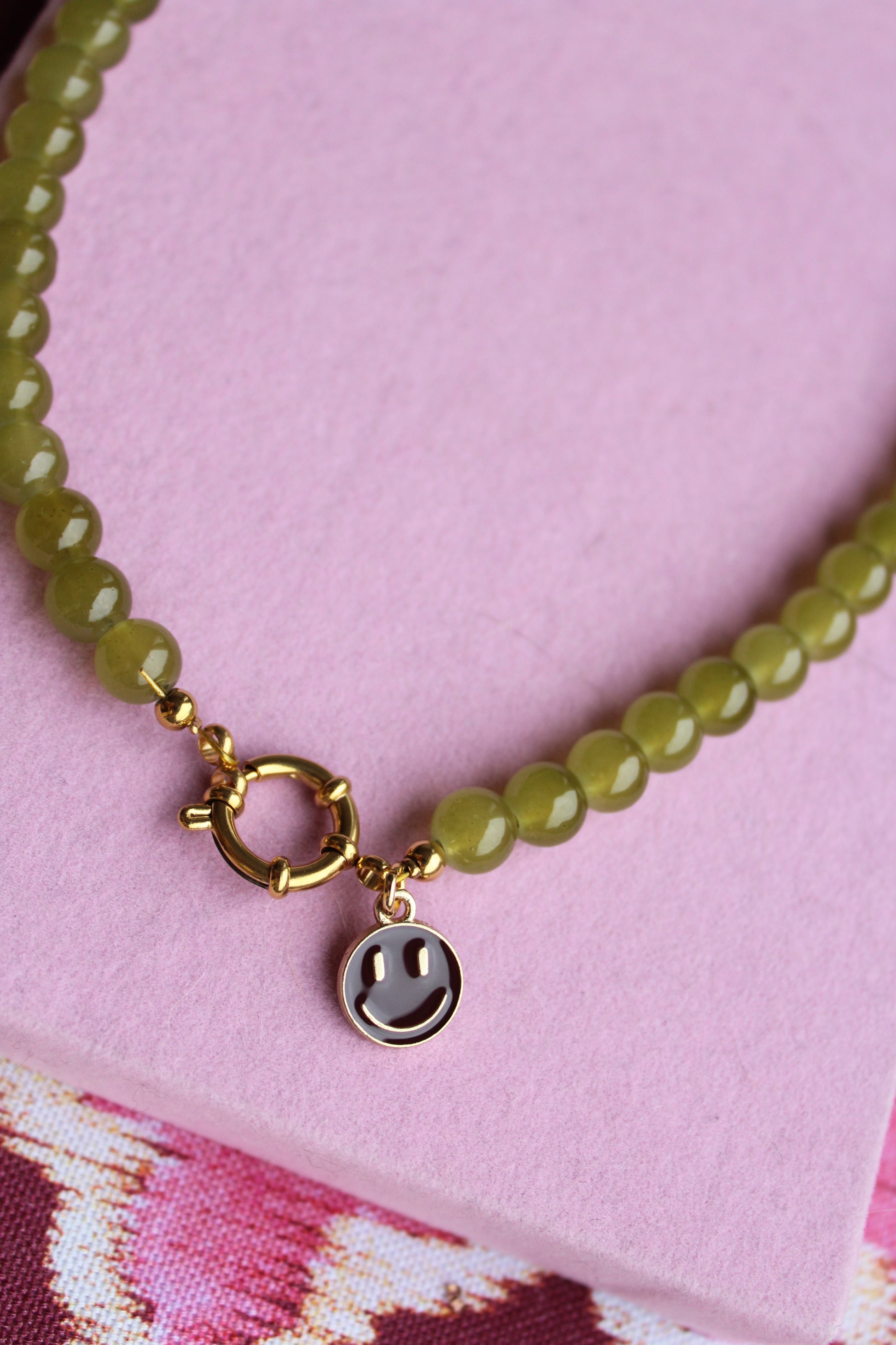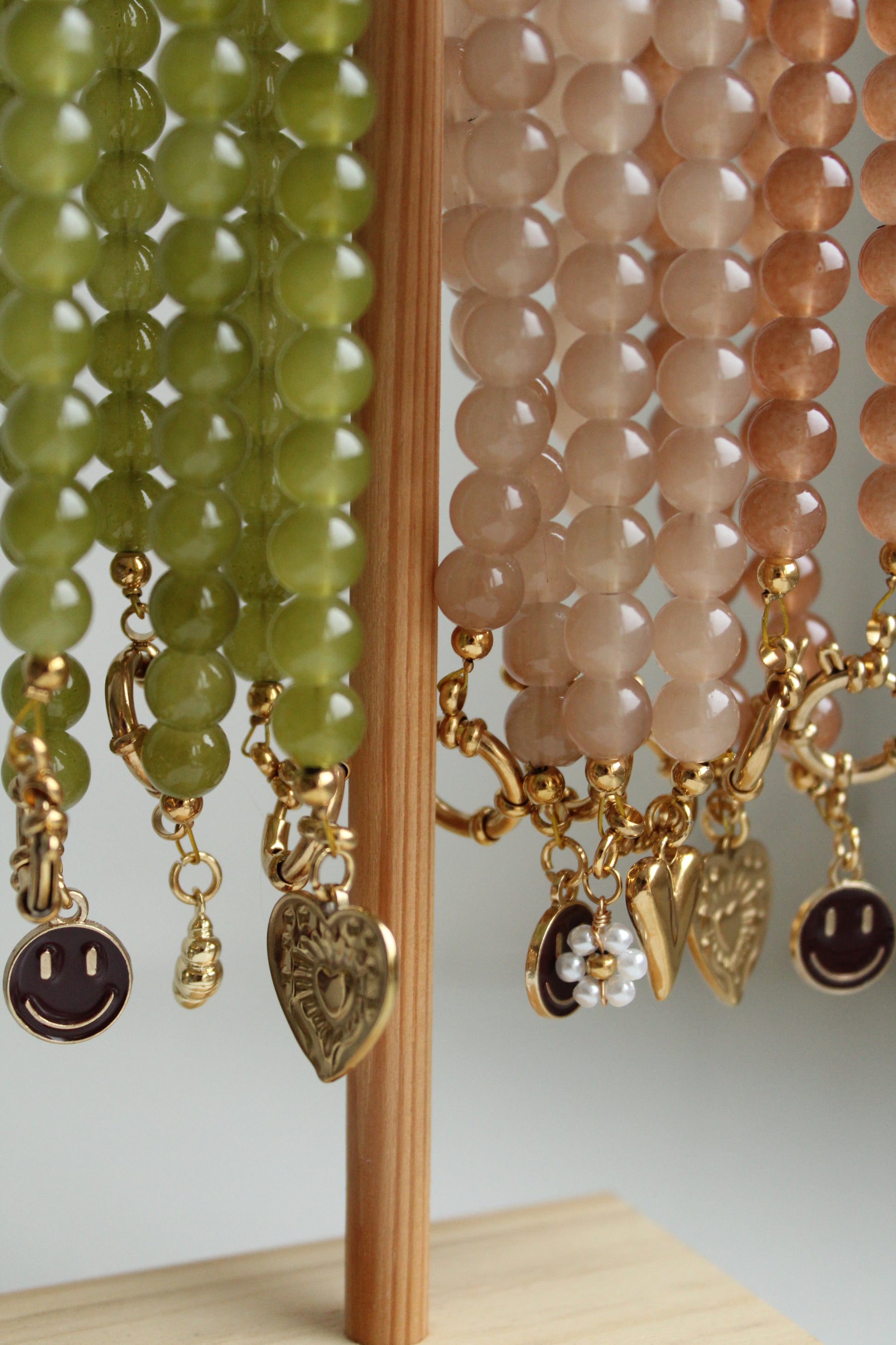 Groene glaskralen 8mm. Afgewerkt met een prachtige gouden bedel. Keuze uit een croissant, een hartje of een bruine smiley. 🤎🥐✨