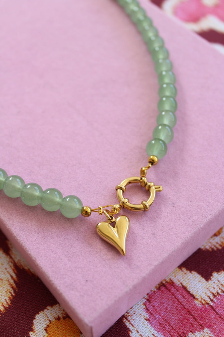 Zee groene 12 mm kralen ketting. Afgewerkt met een prachtige hart bedel. 💛